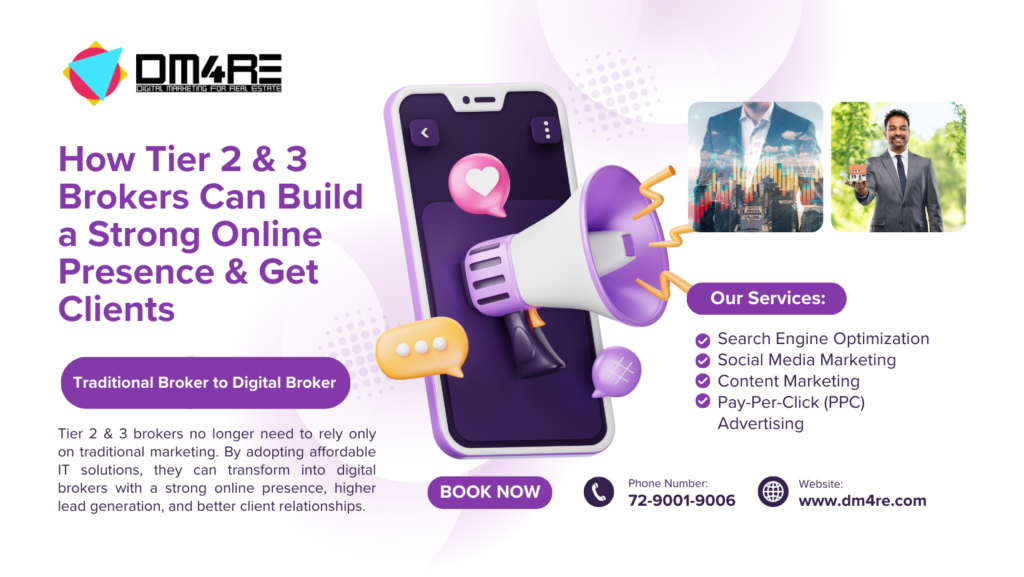 This article presents a complete 3000-word strategy for Tier 2 & 3 brokers to build an online presence, attract clients at an affordable price, and compete with big players. All strategies include realistic steps, cost comparisons, and DM4RE.com-powered solutions.